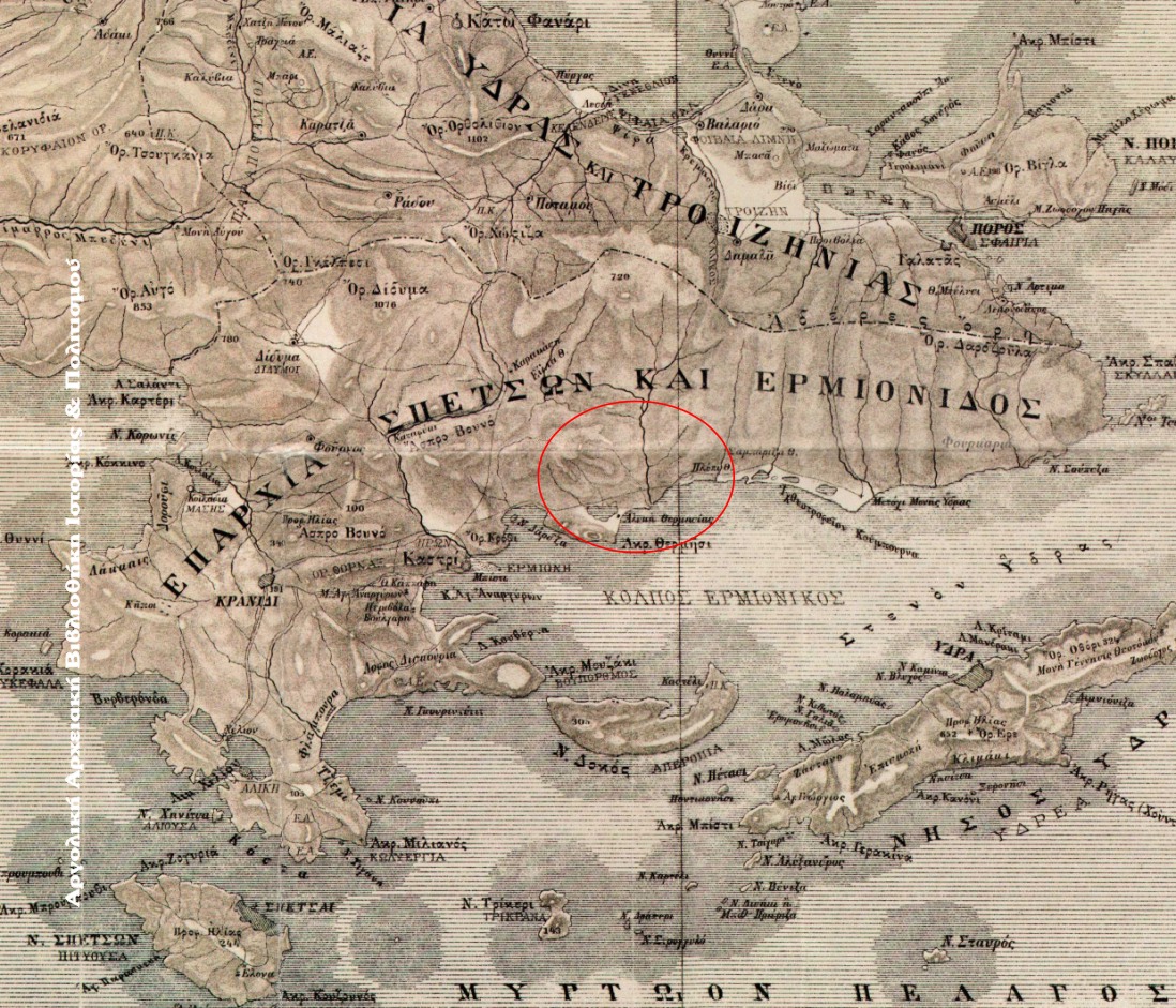 Θερμήσι – Τμήμα χάρτη της Αργολιδοκορινθίας του Αντώνη Μηλιαράκη, 1886.