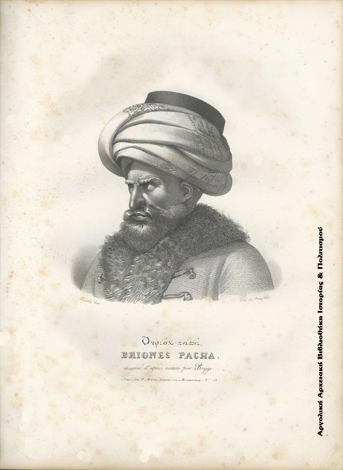 Ο Πασάς του Μπερατίου και στρατηγός Ομέρ Βρυώνης πολυτελώς ενδεδυμένος και με εντυπωσιακό κάλυμμα κεφαλής (τουρμπάνι). Λιθογραφία του Giovani Boggi από το λεύκωμα με 24 πορτρέτα Ελλήνων και Οθωμανών αξιωματούχων που έδρασαν κατά την Ελληνική Επανάσταση με τίτλο: «Collection de portraits des personnages Turcs et Grecs les plus renommés soit par leur cruauté soit par leur bravoure dans la guerre actuelle de la Grèce».