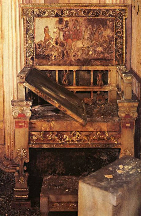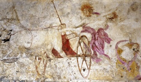 Ζωγραφική παράσταση του Πλούτωνα και της Περσεφόνης σε τέθριππο πάνω στο θρόνο.