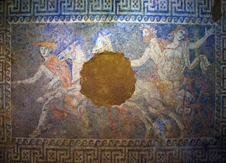 Το ψηφιδωτό του δευτέρου θαλάμου με τη σκηνή της αρπαγής της Περσεφόνης από τον Πλούτωνα.