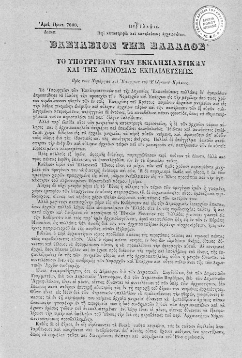 Η παραπάνω πρακτική, λοιπόν, ανάγκασε το Μάιο του 1837 την επί των Εσωτερικών Βασιλική Γραμματεία να αποστείλει εγκύκλιο, [7] με την οποία, μέσω του Διοικητών των Νομών, έδινε εντολή στους Δημάρχους αφενός να εκδώσουν αυστηρές διαταγές προς τους δημότες και αφετέρου οι ίδιες οι Δημοτικές Αρχές να δείχνουν ιδιαίτερη προσοχή «εις την διατήρησιν των σωζομένων αρχαιοτήτων». Και τούτο γιατί η Κυβέρνηση είχε πληροφορίες «από υποκείμενα αξιόπιστα περιελθόντα διαφόρους Επαρχίας… ότι εις πολλά μέρη συντρίβονται και ακρωτηριάζονται αρχαίοι λίθοι, μεταφερόμενοι από ναούς και άλλα μνημεία εις τας πόλεις και τα χωρία προς χρήσιν δημοσίων και ιδιωτικών οικοδομών». Μάλιστα, προειδοποιούσε τους δημότες ότι «όστις συντρίψει ή ακρωτηριάσει αρχαιότητά τινα θέλει καταμηνύεται εις τον αρμόδιον εισαγγελέα διά να ενεργούνται κατ’ αυτού τα παρά του νόμου διακελευόμενα».
