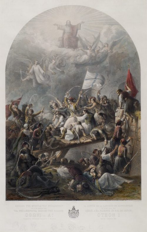 Σκηνή από τις τελευταίες στιγμές του Μεσολογγίου. Μεσολογγίτισσα έχει σκοτώσει το παιδί της, τον Τούρκο που αποπειράθηκε να τη βιάσει και ετοιμάζεται να αυτοκτονήσει. Ελαιογραφία του François-Émile de Lansac, 1827. Πινακοθήκη Δήμου Μεσολογγίου.