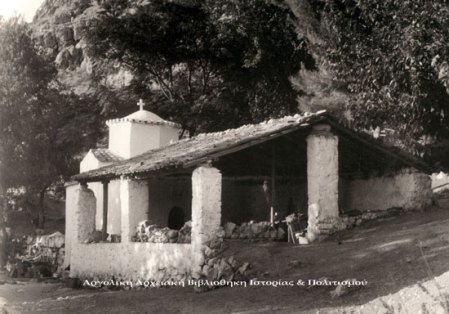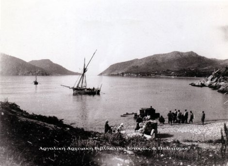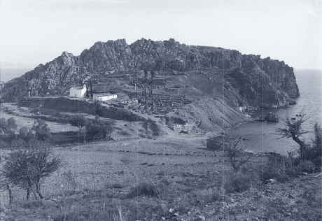 Κατ’ αντίθετη φορά, άποψη του γυμνού λόφου της Ασπίδας, με το εκκλησάκι του Άη-λιά στην κορυφή (φωτ. του W. Vollgraff, από Le sanctuaire d’ Apollon Pythéen à Argos ÉtPélop 1 [1956], σ. 10, εικ. 4, και με την υπόμνηση «συνολική άποψη του τόπου των ανασκαφών».