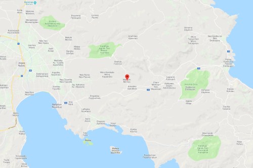 Το χωριό, ξανοιγμένο οριζόντια πάνω στην πλαγιά Μπρίνια, έχει στα νοτιοανατολικά του πρόπυλο την Παλιά Μονή Ταλαντίου – ερειπωμένη πια – σε μια απόσταση 100 μ. από τα πρώτα του σπίτια. Λιγνά κοκκινοχώματα και γκρίζες ξερολιθιές περιβάλλουν τη Μονή και το Αραχναίο. Βουνίσιο, βασανισμένο χωριό – οι Γερμανοί του είχαν κάψει στην Κατοχή τα σπίτια. Κτηνοτροφικό, με 1200 ανθρώπους περίπου, είναι διπλοκατοικία άλλων χωριών: της Δήμαινας, της Μιδέας, του Λιγουριού. Καλοχτισμένα πλατύστομα πηγάδια παντού, δείχνουν ακόμη και μέσα στο χωριό τις περίσσιες ανάγκες του για νερό. Με φημισμένους σε παλιά χρόνια τσελιγκάδες και ηρωικούς ληστές όπως οι Δρουγκαΐοι και ο Λύγκος ο Χελιώτης – ληστής προστάτης των φτωχών – κυριάρχησε το χωριό στα άγρια μονοπάτια του όρους Αραχναίου, που ήταν ως την Ενετοκρατία δασωμένο. Από τους αμέρευτους εκείνους καιρούς, έμεινε ηχώ το τραγούδι τούτο: