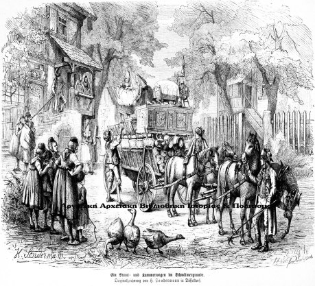 Η γαμήλια άμαξα με τη νύφη, το γαμπρό κα τον πάροχο (μελανόμορφο αττικό αγγείο του ζωγράφου Άμαση, 550 π.χ.)