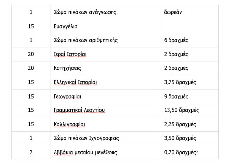 Να σημειώσουμε ότι με το υπ’ αριθμ. 651/21 Ιουνίου 1851 έγγραφό του ο Γενικός Επιθεωρητής των Δημοτικών Σχολείων Πελοποννήσου Ιωάννης Κοκκώνης ζήτησε τον αριθμό, το είδος και το κόστος των βιβλίων της βιβλιοθήκης του Σχολείου του Διδύμου. Υποβλήθηκε η παρακάτω ανυπόγραφη κατάσταση με το συνολικό κόστος των βιβλίων να ανέρχεται στις 46,60 δραχμές. Για την ιστορία αναφέρουμε ότι τα βιβλία αυτά ήσαν τα εξής: