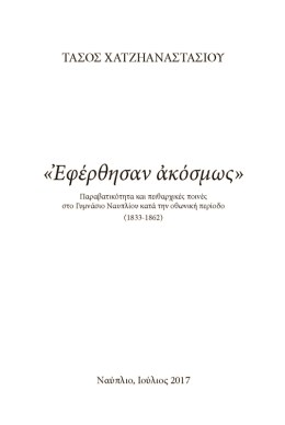 «Εφέρθησαν ακόσμως» – Παραβατικότητα και πειθαρχικές ποινές στο Γυμνάσιο Ναυπλίου (1833-1862) – Τάσος Χατζηαναστασίου, έκδοση Ίδρυμα Ιωάννης Καποδίστριας, Ναύπλιο, 2017.