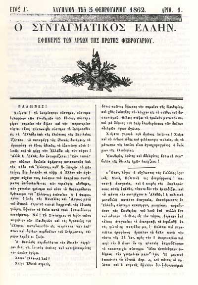 Την 5η Φεβρουαρίου 1862 κυκλοφόρησε στο Ναύπλιο το πρώτο φύλλο της εφημερίδας Ο ΣΥΝΤΑΓΜΑΤΙΚΟΣ ΕΛΛΗΝ, με υπότιτλο ΕΦΗΜΕΡΙΣ ΤΩΝ ΑΡΧΩΝ ΤΗΣ ΠΡΩΤΗΣ ΦΕΒΡΟΥΑΡΙΟΥ. Τυπωνόταν στο τυπογραφείο του Κ. Ιωαννίδη και είχε συντάκτη τον Θεόδωρο Φλογαΐτη.