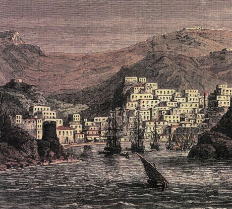 Το λιμάνι και η πόλη της Ύδρας τον 19ο αιώνα, σε χαλκογραφία του Barclay. Ιστορικό Αρχείο – Μουσείο Ύδρας.