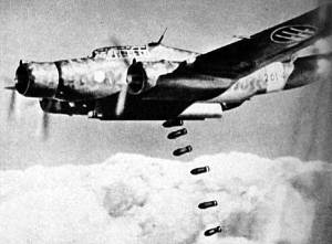Ένα σμήνος από καμμιά τριανταριά Αγγλοαμερικανικά αεροπλάνα, όλα δικινητήρια, πετάν μεγαλόπρεπα σε σχηματισμό χήνας πάνω από τη πόλη κι ο πληθυσμός περήφανα και με κρυφό καρδιοχτύπι τα καμαρώνει και καρτεράει με κρυφή χαρά να φτάσουνε έγκαιρα στ’ αεροδρόμι των Ούννων και να τους γαζώσουνε κυριολεκτικά, μια και κυριάρχησαν στον αέρα πια.