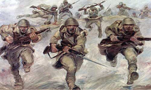 Ο κροταλισμός των πολυβόλων, ο γδούπος των κανονιών και το υπόκωφο χτύπημα των ταχυβόλων ταράζει σύγκορμα τ’ ανθρώπινο κουφάρι και τα νεύρα σπάνε ανεπανόρθωτα.