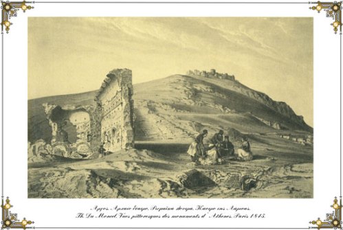 Η άποψη αυτή ενισχύεται καταλυτικά από τη γνωστή μοναδική γκραβούρα του περιηγητή (Th) Du Moncel, που είχε επισκεφθεί το Άργος το 1845 και έχει χαράξει το επώνυμό του στον υπόγειο τεκέ. Στην σημαντική γκραβούρα του 1845 εικονίζεται η γενική άποψη της Λάρισας του Άργους από τα νοτιοανατολικά. Σε πρώτο πλάνο εικονίζονται οι Θέρμες, το Σαραπείο σε πλήρη λεπτομέρεια και σε δεύτερο πλάνο το αρχαίο Θέατρο, ο λόφος και το κάστρο της Λάρισας.