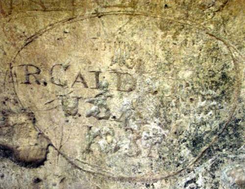 Το πιθανότερο πρόκειται για κάποιο αμερικανό, Φιλέλληνα των χρόνων της Ανεξαρτησίας και πρέπει να ερευνηθεί η ταυτότητα του προσώπου. Άλλα καλογραμμένα με κεφαλαία γράμματα επώνυμα στη βόρεια πλευρά σώζονται τα εξής: «RIEUX», ύψος γραμμάτων 7-8 εκ., «SVIN», «DOODD 1825», «CHIND». Τα επώνυμα «R.CALDER, USA 1831», «RIEUX», «SVIN» έχουν όμοιο επιμελημένο τρόπο χάραξης κα προφανώς χρονολογούνται όλα στην ίδια εποχή, το 1831.