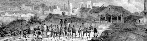Τα μέλη της επιστημονικής επιτροπής της «Εκστρατείας του Μοριά» συνοδευόμενα από Γάλλους στρατιώτες στην είσοδο της Τριπολιτσάς. Λιθογραφία (λεπτομέρεια) του Prosper Baccuet, 1836.