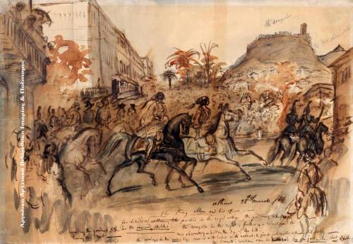 Ο Βασιλιάς Όθωνας και η Βασίλισσα Αμαλία έφιπποι στην Πλατεία Συντάγματος, Αθήνα, 25 Μαρτίου 1854, ακουαρέλα και μελάνι. Έργο του Γάλλου ζωγράφου και εικονογράφου για βρετανικές και γαλλικές εφημερίδες, ανταποκριτή του Κριμαϊκού Πολέμου, Constantin Guys, (1802-1892).