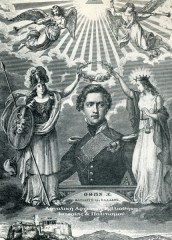 Όθωνας. Αλληγορική εικόνα από τη στέψη του Όθωνα. Λιθογραφία από το Λεξικό της Ελληνικής Γλώσσας, του Άνθιμου Γαζή, Βιέννη, 1835.