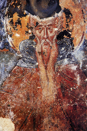 Η Συνάντησις: Άγιος Πέτρος Επίσκοπος Άργους – Όσιος Θεοδόσιος ο Νέος. Αγιογράφοι: Βασίλης Δήμας – Γιώργος Αγγελής. Τοιχογραφία. Ιερός Ναός Αγίου Βασιλείου Άργους.
