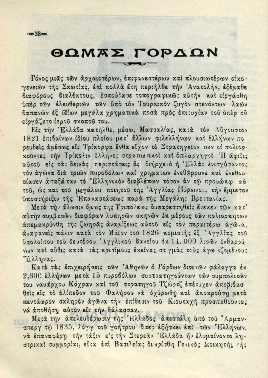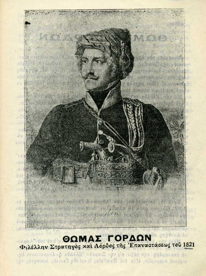 Thomas Gordon, «History of the Greek revolution, and of the wars and campaigns arising from the struggles of the Greek patriots in emancipating their country from the Turkish yoke», [Ιστορία της ελληνικής επανάστασης και των πολέμων και εκστρατειών που προέκυψαν από τους αγώνες των Ελλήνων πατριωτών για τη χειραφέτηση της χώρας τους από τον τουρκικό ζυγό]. Τόμος I & II. Δεύτερη έκδοση. Gordon, Thomas, F.R.S. Εκδόθηκε από τους William Blackwood και T. Cadell, Εδιμβούργο και Λονδίνο, 1834 (συλλογή ΕΕΦ).