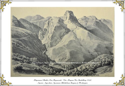 Γκραβούρες – Καρύταινα (Καρίταινα) Αρκαδίας – Otto Magnus von Stackelberg, λιθογραφία από το έργο του, «La Grece. Vues pittoresques et topographiques, dessinus par O.M baron de Stackelberg». ( Ελλάδα – γραφικά τοπία και τοπογραφικά τοπία, δημιουργίες του Otto Magnus, βαρώνου του Stackelberg). Παρίσι 1834.